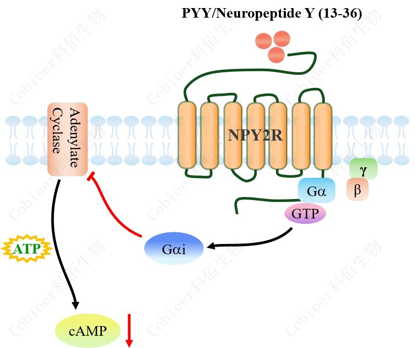 cAMP 在 G 蛋白偶聯受體(GPCR)信號轉導中是一種關鍵的第二信使。當配體結合 到 GPCR,構象發(fā)生變化,激活受體接著激活 G 蛋白,Gi 的激活導致腺苷酸環(huán)化酶調控 cAMP 的下調。NPY2R CHO 藥靶模型很好的模擬了體內 NPY2R 的信號轉導過程,原理見 下圖所示。