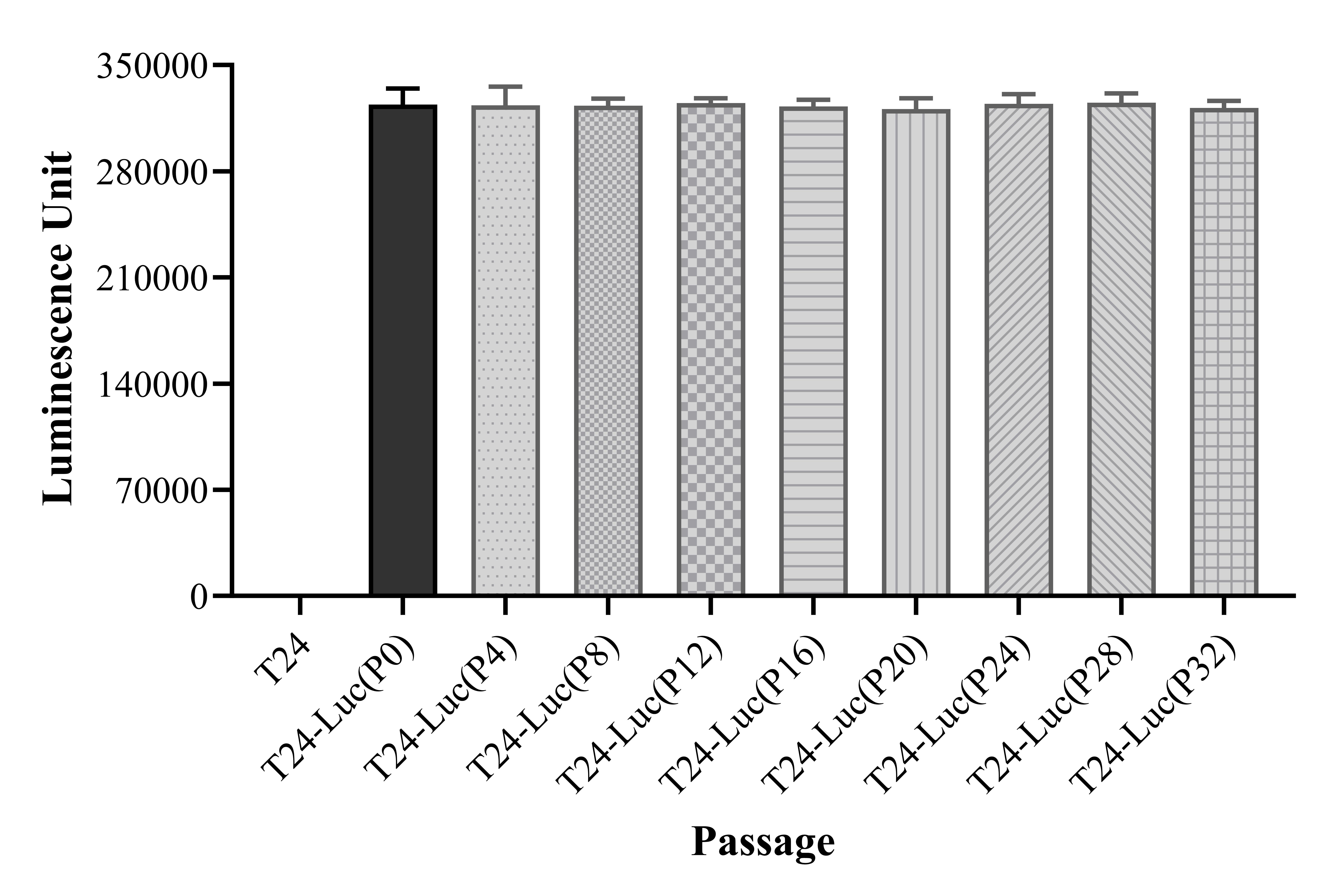 Figure 1. Stablity test results. T24-Luc showed at least 32 passage stability with similar luminescence unit. |