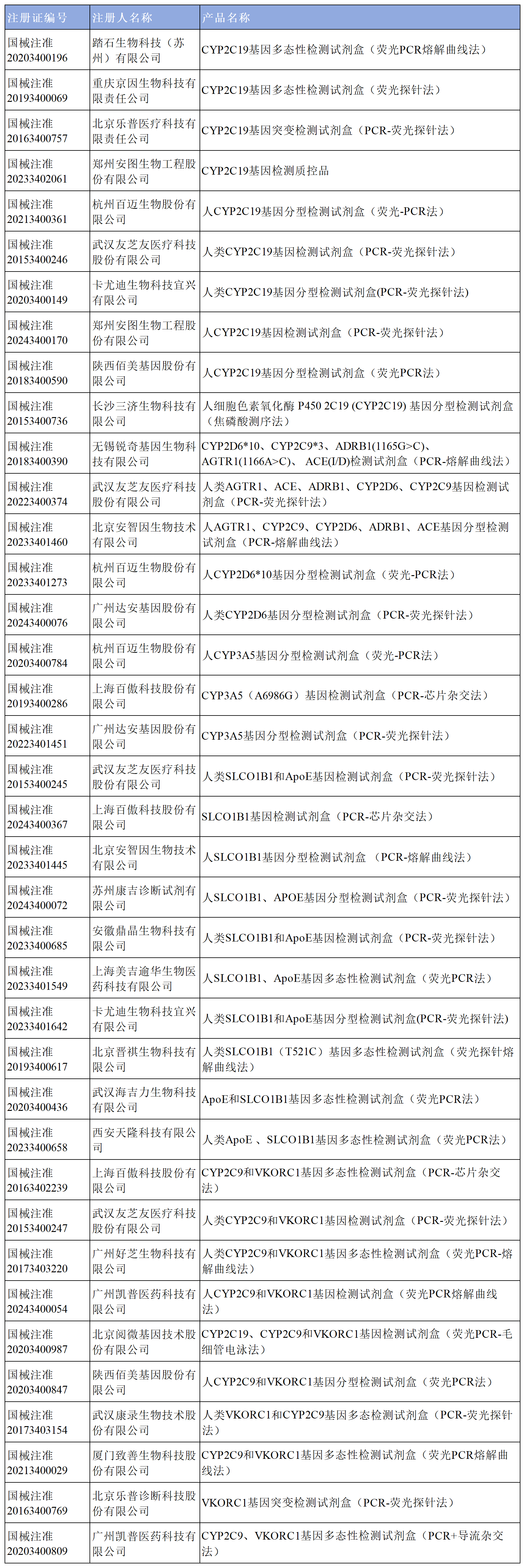 截至2023年9月,國內(nèi)批準個性化用藥相關(guān)基因檢測產(chǎn)品包括CYP2C19、CYP2C9、UGT1A1、CYP2D6、ALDH2、CYP3A5、SLCO1B1、VKORC1、APOE、ACE、TOP2A、PML-RARα等標志物。檢測常用的方法有實時熒光聚合酶鏈反應(yīng)(polymerase chain reaction,PCR)、PCR?電泳分析、PCR-基因芯片法、PCR-Sanger測序、熔解曲線法等分子生物學(xué)方法。