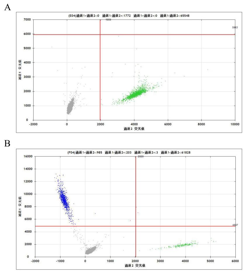 Figure 4:Gene Edited BTK[C481S] Isogenic Cell-ddPCR結果(通道1 藍色微滴代表BTK C481S 突變陽性,通道2 綠色微滴代表該位點為陰性野生型)