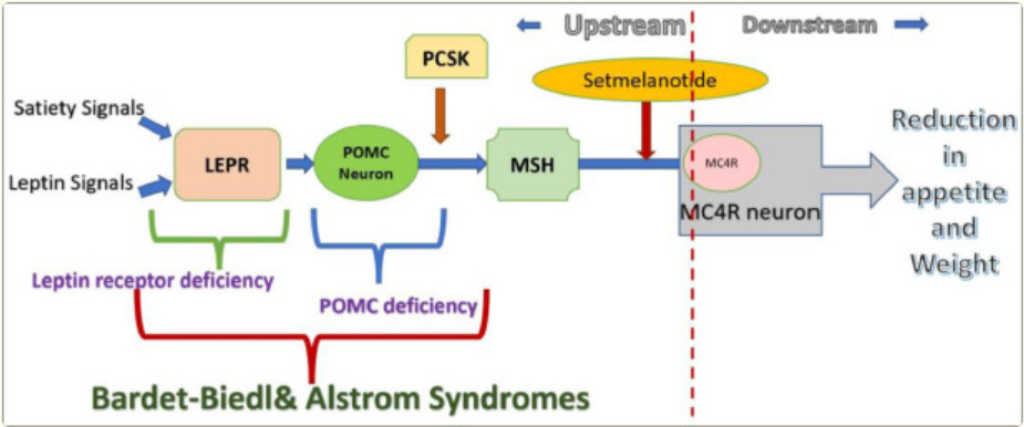 當外周給藥時,Setmelanotide可以穿透血腦屏障,作用于下丘腦的室旁核和下丘腦外側(cè)區(qū),這兩個與食欲調(diào)節(jié)相關(guān)的區(qū)域。通過與 MC4R 結(jié)合,它填補了下丘腦瘦素 - 黑皮質(zhì)素通路中缺失的一環(huán),從而抑制食欲并改善胰島素抵抗。它還能通過將底物氧化轉(zhuǎn)向脂肪,從而提高靜息能量消耗。