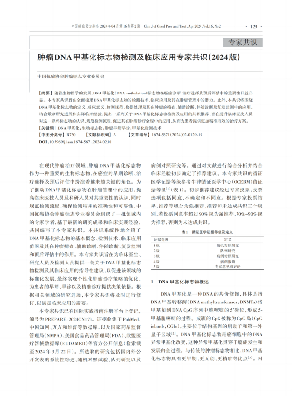 2024年4月,《腫瘤DNA甲基化標(biāo)志物檢測(cè)及臨床應(yīng)用專家共識(shí)》于中國(guó)癌癥防治雜志重磅發(fā)布。